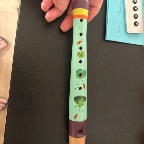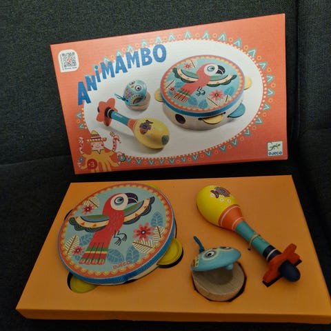 Moulin Roty træ rasle legetøj med blå farve og dekorative fiskemotiver. Legetøjet er formet til nem håndtering og egnet til små børn.
