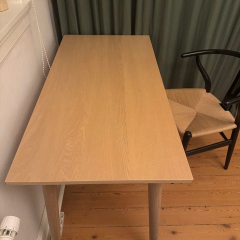 Med 2 skuffer i hvidpigmenteret lakeret egefinér. Bordben i hvidpigmenteret lakeret eg.
