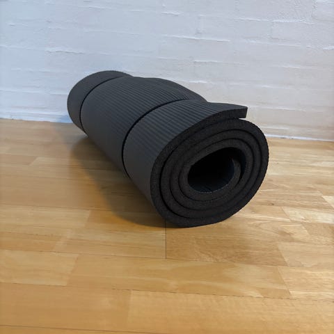 Yoga eller bare træningsmåtte. Tykkelse 1cm eller 100 mm. På billedet er den lige vasket af og ikke helt lige, fordi den blev opbevaret sammenfoldet, men den bliver lige igen, hvis den bliver brugt :) jeg har en anden i lyserødt. Køb begge til 150kr.