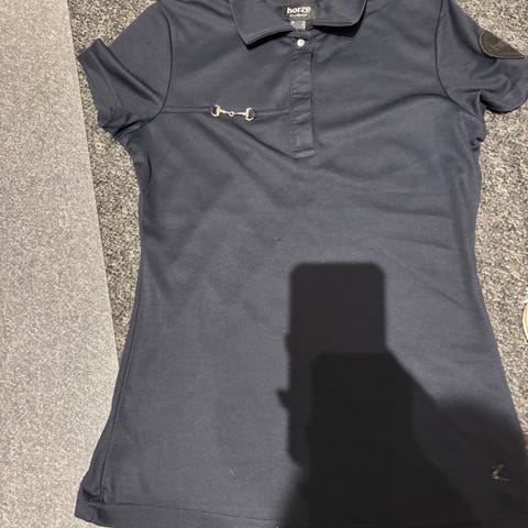 Horze stævnepolo med “lufthuller” på hele ryggen. Den er godt brugt og har nogle sorte pletter hist og her med ikke noget der kan ses med en stævnejakke udover. Er ret sikker på at det er en størrelse 34