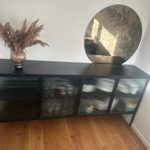 Kommode/skænk i lyst massivt asketræ med tre skuffer og to skabe med justerbare hylder. Møblet har et enkelt, moderne og funktionelt design, velegnet til opbevaring. Købt som ny i 2012 til 15.000kr.