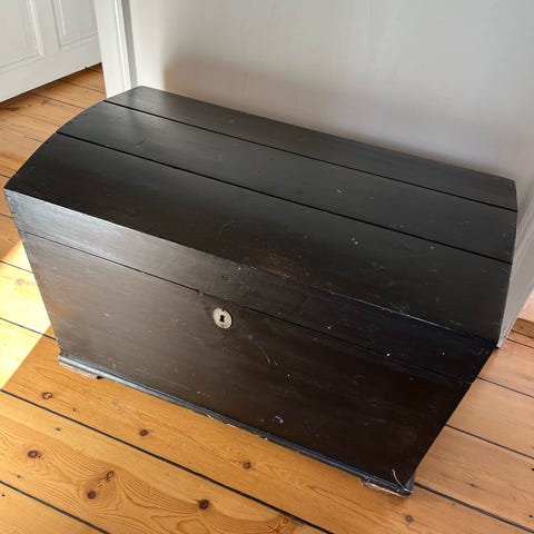 Flot gammel - og tung - trækiste. Den er malet. Uden nøgle men med side-håndtag. Ca 24 cm høj, 33 lang og 22 dyb ca.