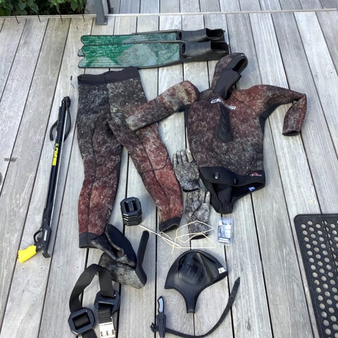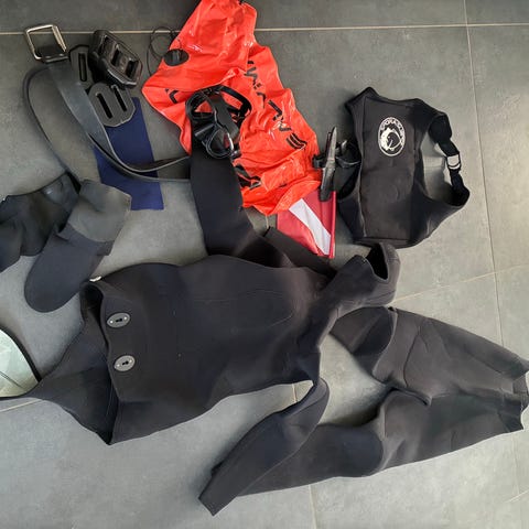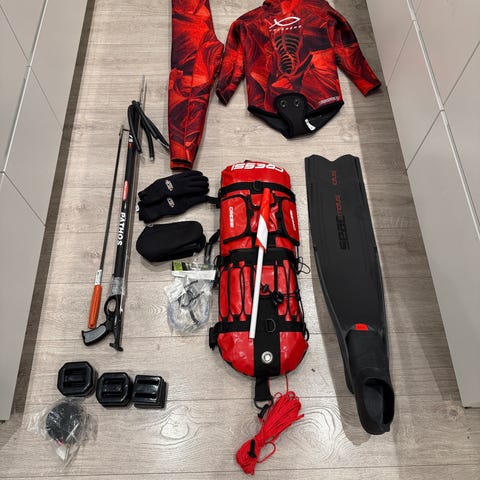 Sæt til undervandsjagt med camouflagemønster. Sættet omfatter todelt våddragt med jakke og bukser i camouflage, matchende neoprenstøvler samt diverse tilbehør som vægtbælte, håndledsremme, liner, vægte og bøje/markeringsflag, harpun mm. Egnet til fridykning og undervandsjagt, hvor der ønskes ekstra isolering og camouflage i vandet.