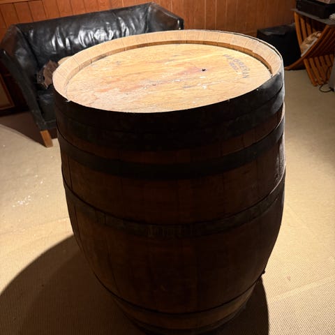 Trætønde med metalbånd. Tønden er restaureret og har en malet, lys inderside og låg.