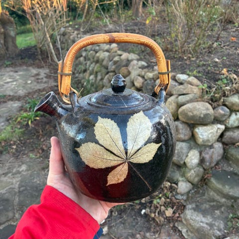 Keramikdelen er 16 cm høj. Småafslag på tud. Uoriginal hank. Den oprindelige i bambus kan stadigvæk købes.