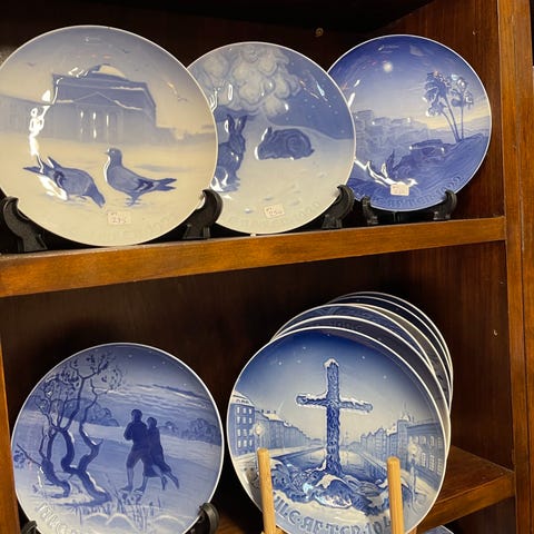 Royal Copenhagen og Bing & Grøndahl Juleplatte Samling bestående af flere dekorative porcelænsplatter med blå-hvide motiver. Platterne viser forskellige jule- og vintermotiver og kan anvendes som pynt eller samlerobjekter.