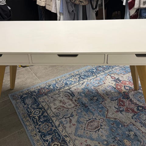 Fint, hvidmalet skrivebord i mål som gør det perfekt til lejligheder eller mindre rum. Jeg har brugt det som kontorplads til hjemmearbejde. Jeg husker desværre ikke mærket, men det er enten IKEA eller ILVA.
