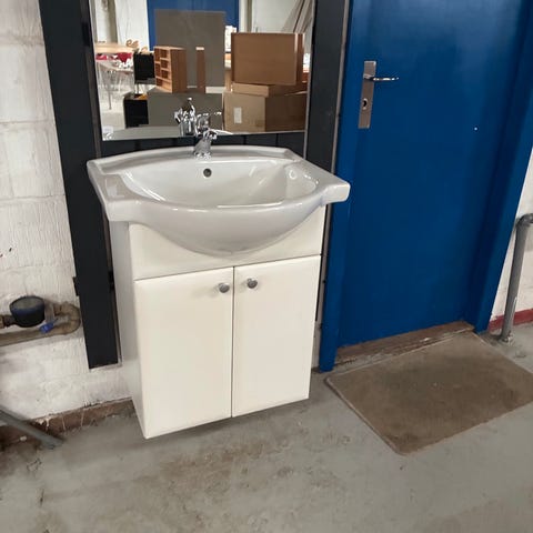 Vasken er hvid med en moderne, kromfarvet vandhane. Vasken er porcelæn. 2 skuffer med håndtag for opbevaring.