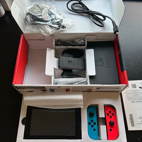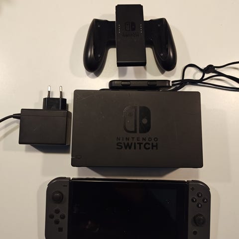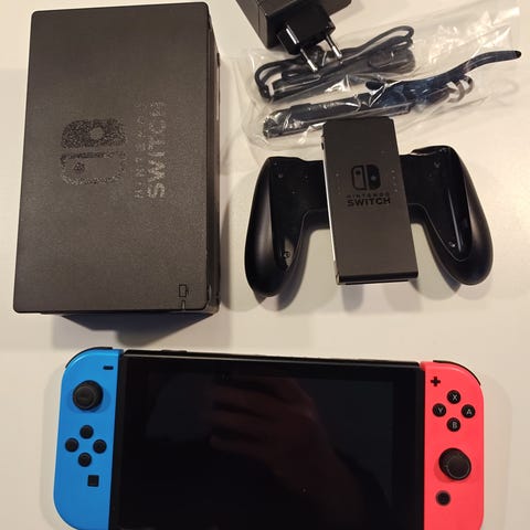 Nintendo Switch konsol med pink Joy-Con controllere. Inkluderer oplader, håndgreb til bedre spilkontrol, og et pink transportetui. Yderligere fire Joy-Con knapper i matchende pink og lilla farver. Konsollen er egnet til både mobil og stationær spiloplevelse.