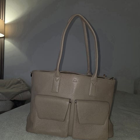 Arbejdstaske fra Markberg. Aldrig brugt. Okselæder. Den måler 40 cm i bredden. 32 cm i højde og bunden måler 12 cm i dybden.