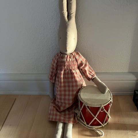 Maileg dukker med røde og lyserøde tørklæder. Dukkerne har stribet og mønstret tøj i bløde materialer. Velegnet som legetøj til børn. Sendes med dao for 45kr