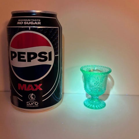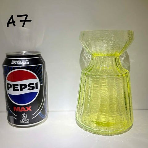 Uranium - Ukendt mærke, bestående af to flødekander, en sukkerskål, en ske ( på str. med spiseske) 2 små skåle - det ene med lille skår, 1 lille glas med lille skår. Glasset er uranium, har en grønlig farve og gennemsigtigt materiale. Sættet inkluderer forskellige glasgenstande, der kan anvendes til servering eller dekoration. Pris pr del. 75kr, kan sendes efter aftale
