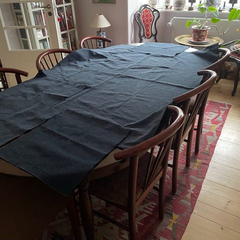 mønstret stof med flerfarvet design i geometriske former. Stoffet er vist med mål, hvor bredden er cirka 80 cm og længden varierer. Materialet og specifikke anvendelsesområder er ikke angivet.