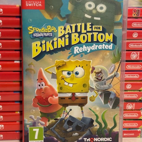SpongeBob SquarePants: Battle for Bikini Bottom Rehydrated Xbox One spil. Spillet er baseret på den populære SpongeBob SquarePants-serie og inkluderer platformspil-elementer. Egnet til Xbox One konsol, med aldersanbefaling fra 7 år og op. Spillet indeholder singleplayer- og co-op-muligheder.