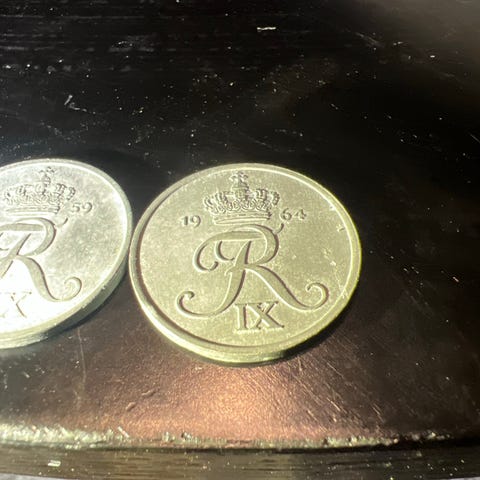 Danmark 5 Øre mønt fra år 1927. Mønten har en cirkulær form med hul i midten og viser Kong Christian X's monogram på den ene side og værdien samt året på den anden side.
