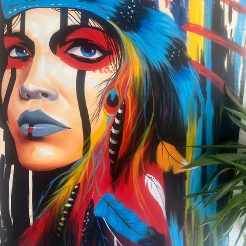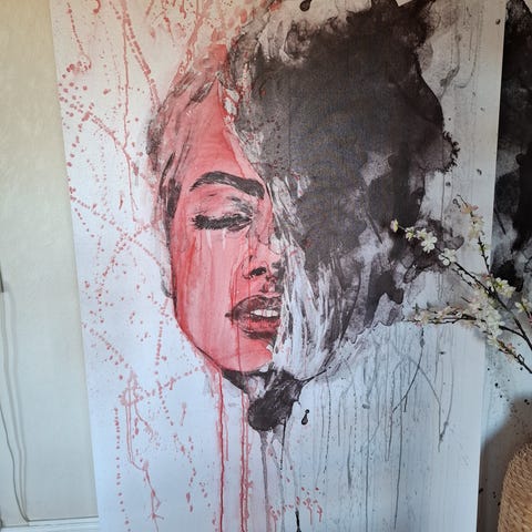 Motivet forestiller et ansigt i opløsning – et spil mellem det feminine og det mørke, det bløde og det voldsomme. De løbende penselstrøg og farvesprøjt giver værket dybde, bevægelse og et meget personligt udtryk.