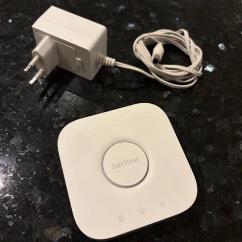 Philips Hue Bridge er en netværkskomponent, der fungerer som central hub til Philips Hue smart belysningssystem. Enheden har en hvid farve og leveres med en strømforsyning. Den muliggør trådløs styring af tilsluttede Hue-lys via netværk.