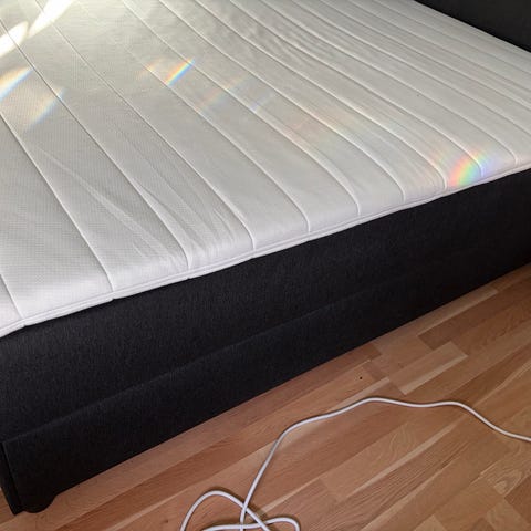 Dreamzone dobbeltseng med mål 140x200 cm. Sengen har en grå stofbetræk og inkluderer både madras og topmadras. Velholdt seng, sælges fordi at vi har fået ny.