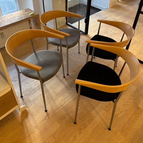 8 sorte stole sælges. De har været brugt på kontor, men har fået lidt slid, som ses på første billede. Højden på sædet er 45 cm