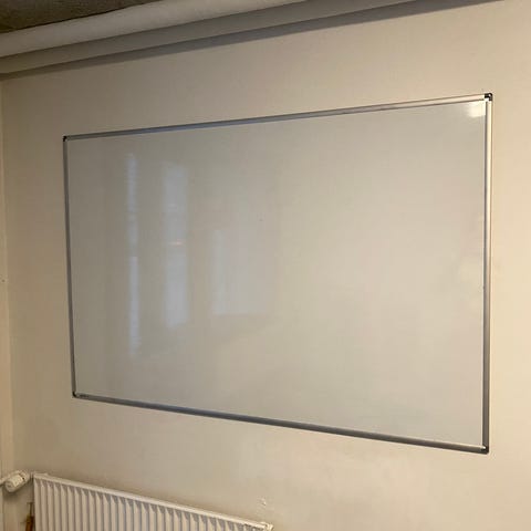 Whitebord, som kan foldes ind og ud sælges. Det er 120 cm højt og 120 cm bredt, når siderne er foldet ind, og 240 cm bredt når siderne begge er foldet ud. Det har brug for en smule kærlighed, men så tror jeg også det kan stå som nyt.