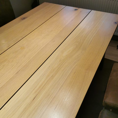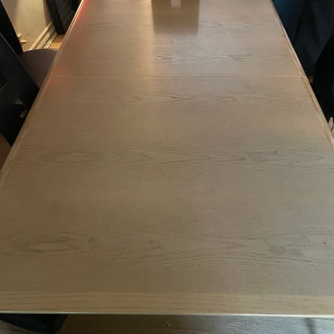 Fint lyst parketstavs spisebord med få skrammer, som kan slibes væk. Bordet er 180 langt men har udtræk så 2 tillægsplader på hver 50 cm kan tillægges, så bordet i alt kan blive 280 cm i længden.