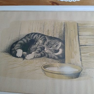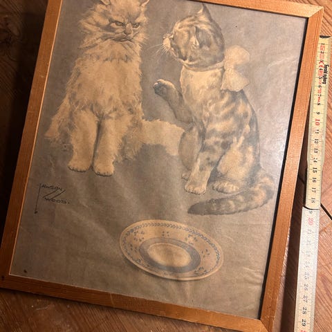 Tegning med motiv af fem katte med en rød bold i en rektangulær ramme. Rammen er lavet af træ og har en lys gul farve. Billedet viser katte i forskellige siddende positioner. Velegnet til ophængning som vægdekoration.