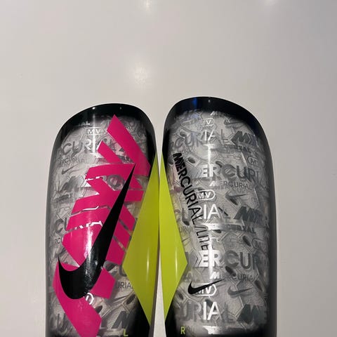 Nike Mercurial skinnebeskyttere i sort farve. De består af en ydre skal med et mønster og en indvendig polstret del for beskyttelse. Leveres med sorte sokker med Nike-logo.