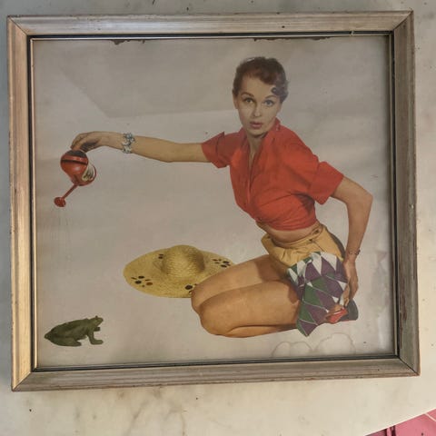 Vintage indrammet billede fra 1950'erne, der viser en kvinde iført lyserødt tøj og påskehareører med fajance æg. Billedet har en neutral farvepalette med detaljer i lyserødt, blå og brun. Indramningen er lavet af træ med en slidt finish. Billedet er egnet til dekorativ brug og har en nostalgisk æstetik.