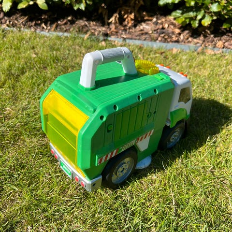 Dusty-lastbil sælges. Lastbilen kan ved at trykke på en knap spise ting, fx andre biler, der kan tømmes ud af bagklappen. Lys, lyd og spisefunktion virker glimrende.