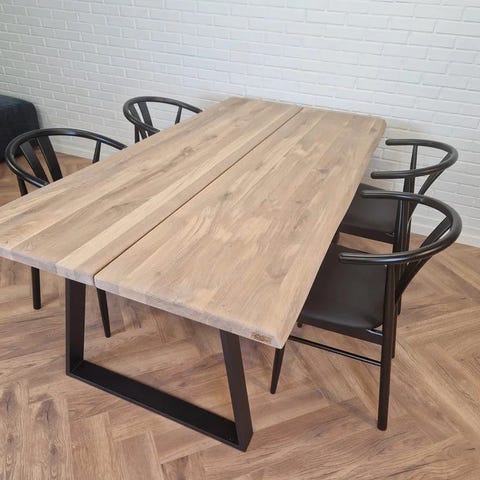 Elegant plankebord med sildebensmønster. Bestående af 2 planker, som gør den helt perfekt til, at skabe et smukt sildebensmønster. Smoked olieret med A stel. Det er muligt, at bestille tillægsplader til spisebordet.