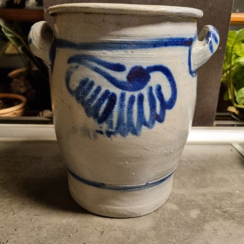 Meget stor lerkrukke, brugt til mel i køkkenet.