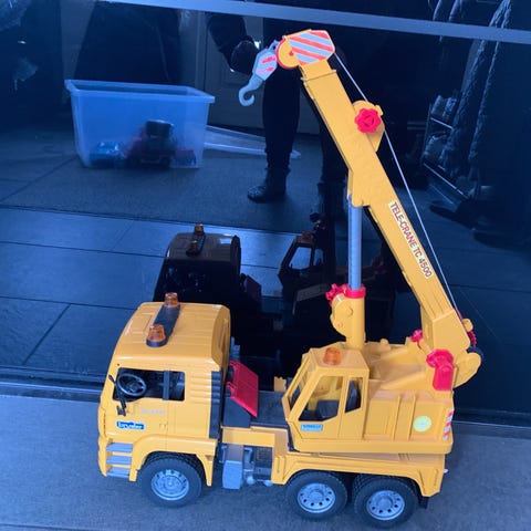 Bruder teleskopkran-legetøjslastbil sælges. Modellen har teleskopisk kranarm og støtteben for stabilitet under brug. Lys og lyd virker glimrende