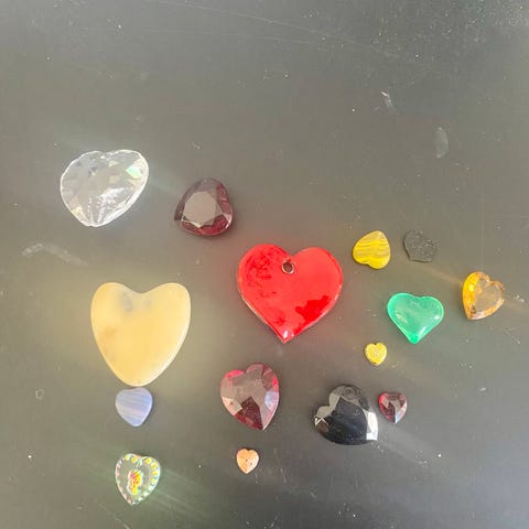 Krystal vedhæng lavet af hvid quartz, formet som en spids krystal, hængende på en sort snor. Vedhænget har en sølvfarvet metalindfatning øverst. Købt i Frederiksberg Centeret