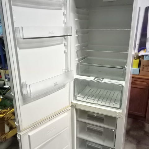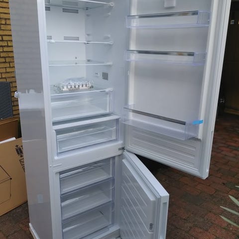 Integreret køle/fryseskab. Fryser med 3 skuffer. Køleskab med 4 glashylder, 4 hylder på lågen og to skuffer i bunden.