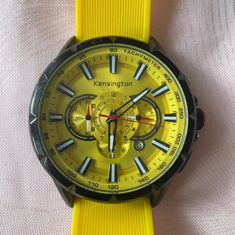 Elegant Kensington Master herreur med grøn skive og matchende grøn rem kombineret med guldfarvet kasse ⌚️✨ Et markant og stilfuldt ur med sporty detaljer.