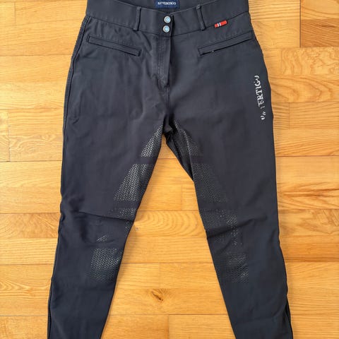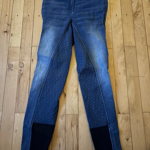 B//Vertigo ridebukser til dame i blå denim. Størrelse S. Jeansene har broderede detaljer og metalplade med mærket på bagpå. Materialet er denim.