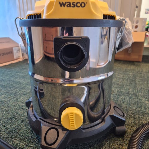 Wetrok støvsuger inklusive slange, mundstykke og ekstra tilbehør. Enheden har en turkis farve og er egnet til rengøring af forskellige overflader i hjemmet. Fungere perfekt.