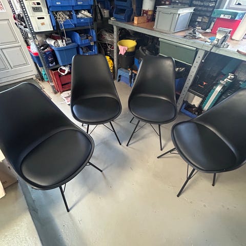 Sæt med 4 stk. Spisebordsstol med sort formstøbt sæde og fastgjort hynde i kunstlæder. Matchende ben i stål.