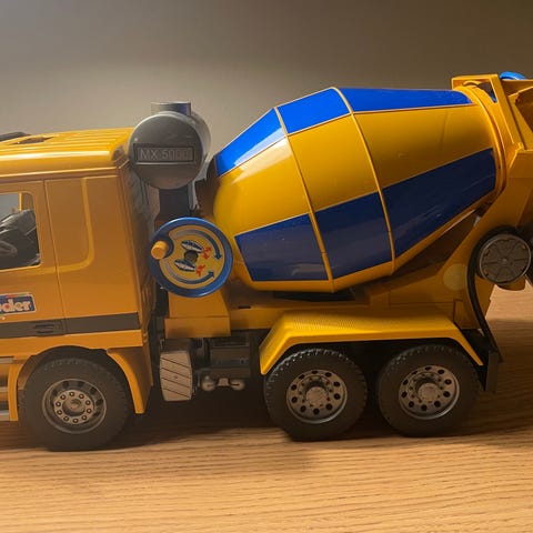 Bruder betonblander. Legetøjet har detaljer som en roterende tromle og udløbsrør til simulering af betonblanding.