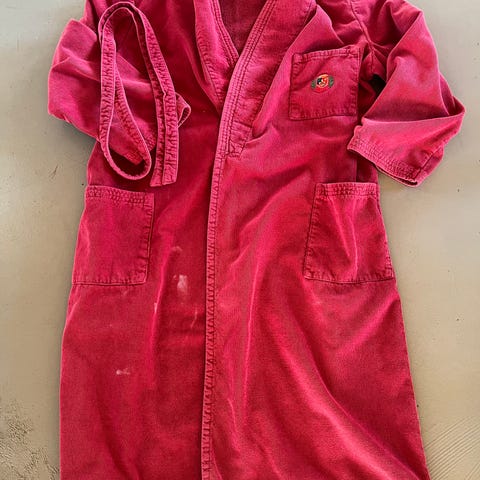 Brugt badekåbe, som du kan hente kvit og frit, trænger til en lille syning ved nakken. Den er altid vasket med parfumefrit vaskemiddel og den er selvfølgelig nyvasket