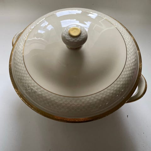 Oblong / afrundet form i hvid porcelæn med farverig dekoration.