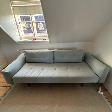 Flot sovesofa fra innovation sælges, kan sættes på mange forskellige måder , overtræk kan medfølge den er velour brun blød normalt men vi har altid brugt overtræk på den