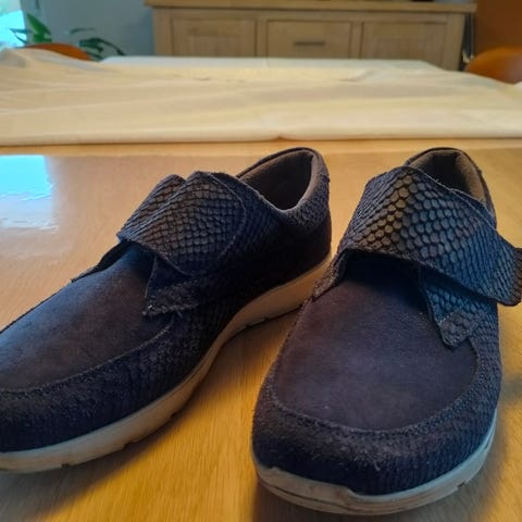 New Feet sneakers i størrelse 38, blå farve. Skoene har snørebånd og en lynlåsdetalje på siden. Sålens mønster giver greb og komfort ved brug.