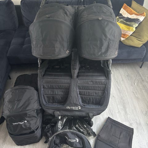 Baby Jogger med liggedel til baby fra omkring 0-6 måneder. Passer til to børn med separate sæder og kalecher. Sæder op til 22 kilo. Medfølger regnslag og dele til at sætte liggedel på. Fungerer upåklageligt. Trænger blot til lidt rengøring. Har været opbevaret inde i huset, når det ikke har været i brug.