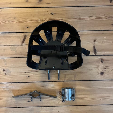 Klassisk sort bulldog sæde m sele og fodstøtter. Helt nyt beslag (smalt).
