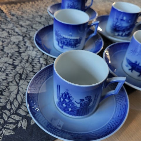 5 sæt julekopper med underkopper og jule sidetallerken.