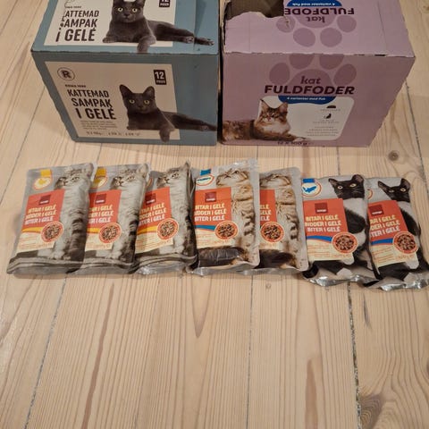 Kattemad, vådfoder, fra fit+fun, 2 kasser, ca 80stk i alt, i gelé og noget som ragout.