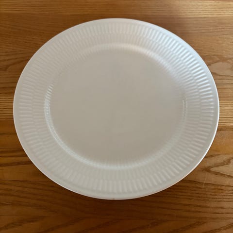 Royal Copenhagen Prinsesse tallerken med blå mønster på hvid porcelæn. Tallerkenen har riflet kant og er designet til brug ved servering af mad.