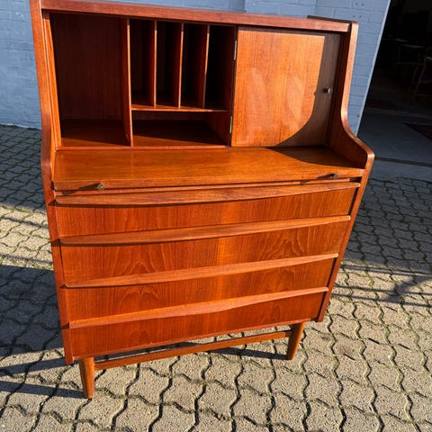 3 rimelige skuffer og arbejdsbord i udtræk med tre små skuffer.
