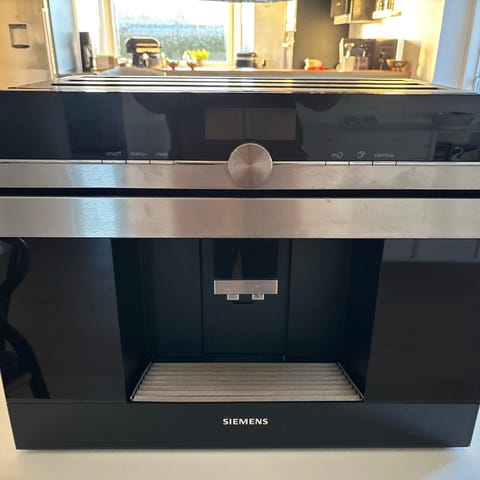 Siemens indbygget kaffemaskine i rustfrit stål. Maskinen er designet til installation i køkkenmoduler og har funktioner til brygning af kaffe og mælkebaserede drikke. Den integrerede enhed har et moderne design med berøringsskærm og drejeknap til betjening.